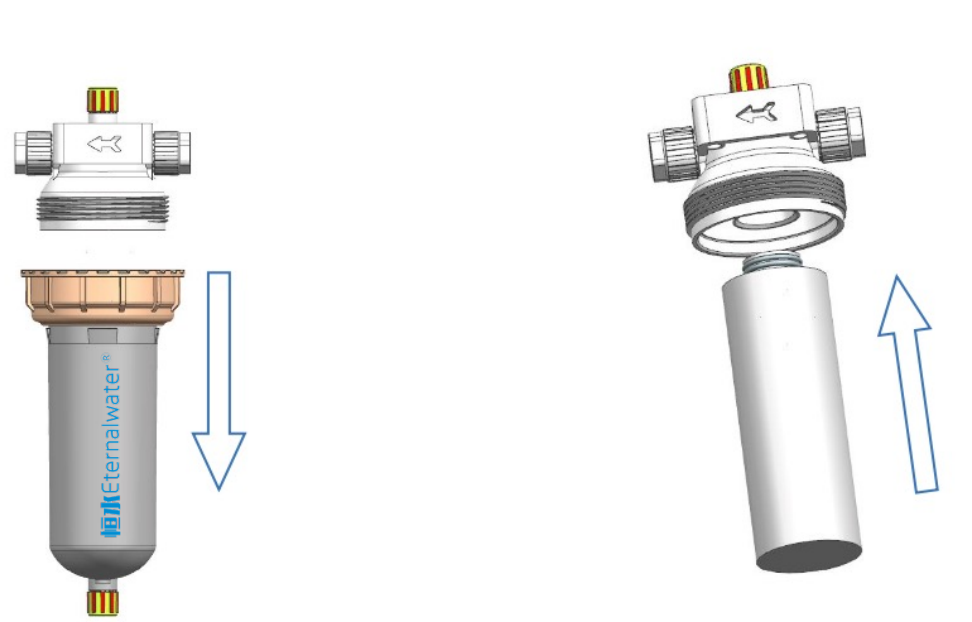 1.松開(kāi)上蓋螺帽,取出過(guò)濾器本體 2.把濾芯裝入過(guò)濾器上蓋