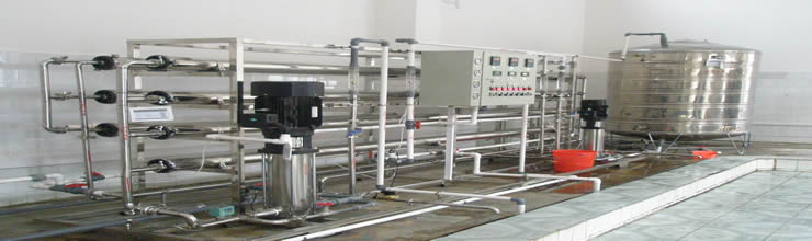 預(yù)處理→反滲透→中間水箱→水泵→EDI裝置→純化水箱→純水泵→紫外線殺菌器→拋光混床→0.2或0.5μm精密過濾器→用水對象(≥18MΩ.CM)