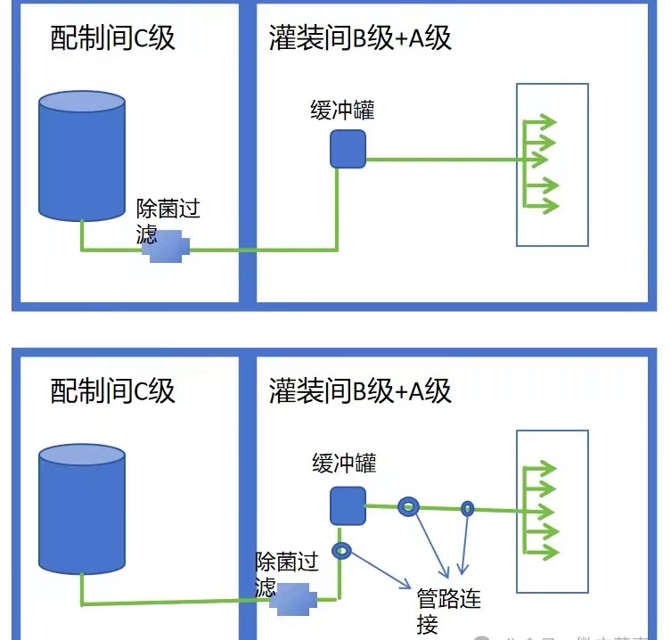 我的問題是下面兩個圖,哪個更符合“除菌過濾濾器應(yīng)當(dāng)盡可能接近灌裝點(diǎn)”?