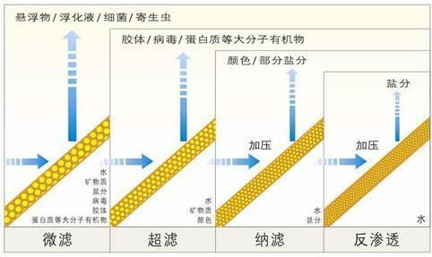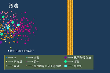 微濾(MF): 孔徑最大(0.1 - 10微米) 分離微米級(jí)成分,能去除細(xì)菌、懸浮顆粒、大膠體,但無法阻擋病毒或大分子。 |
