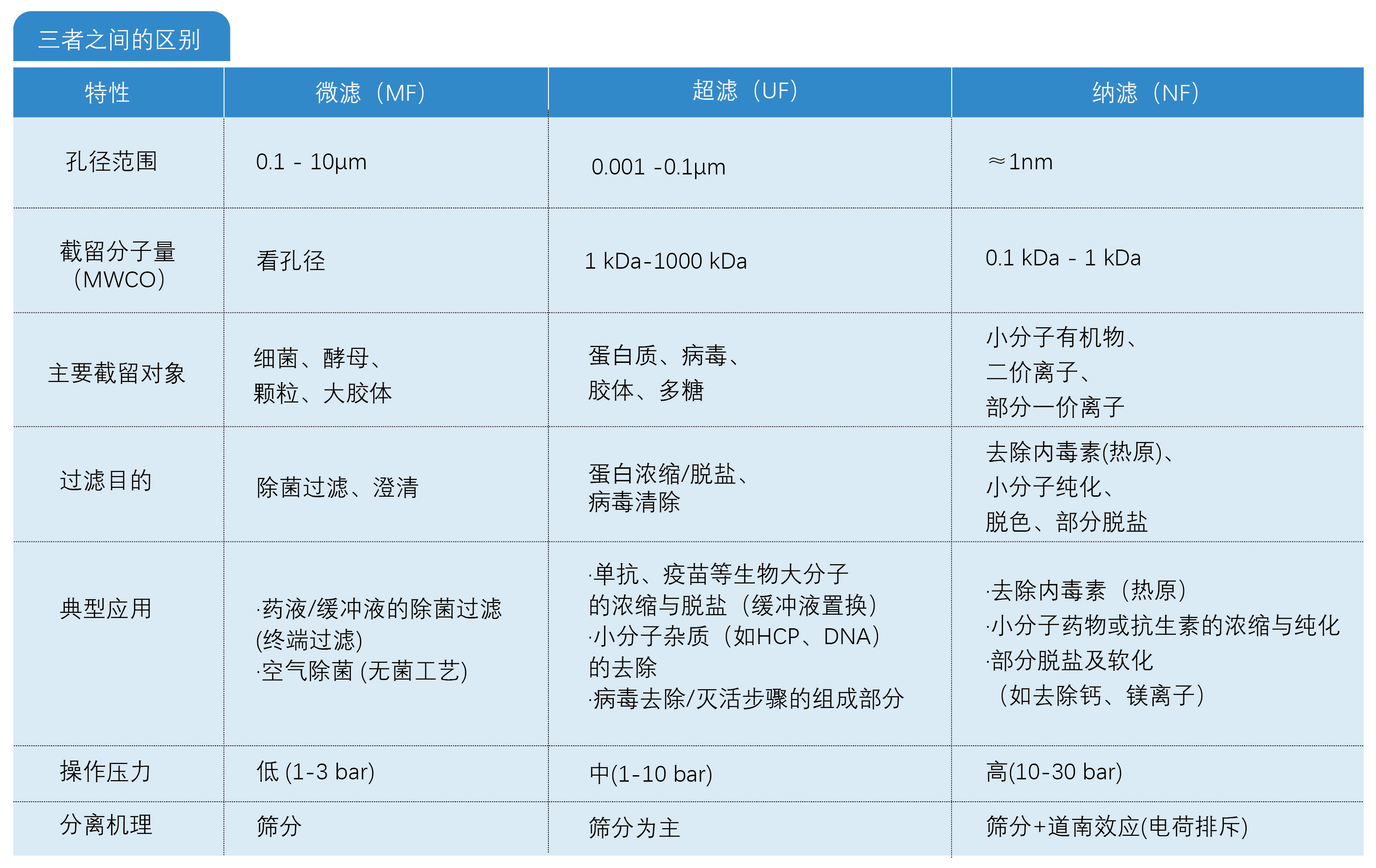 微濾(MF)、超濾(UF)、納濾(NF)這三大膜分離技術(shù)用途存在差異。 不是“大中小”的簡(jiǎn)單排序,而是各有分離原理和目標(biāo)。 三者的核心差異與關(guān)鍵參數(shù)——孔徑和截留分子量。 搞懂孔徑、截留分子量和應(yīng)用邏輯,才是保障制藥工藝高效、產(chǎn)品安全的第一步! |