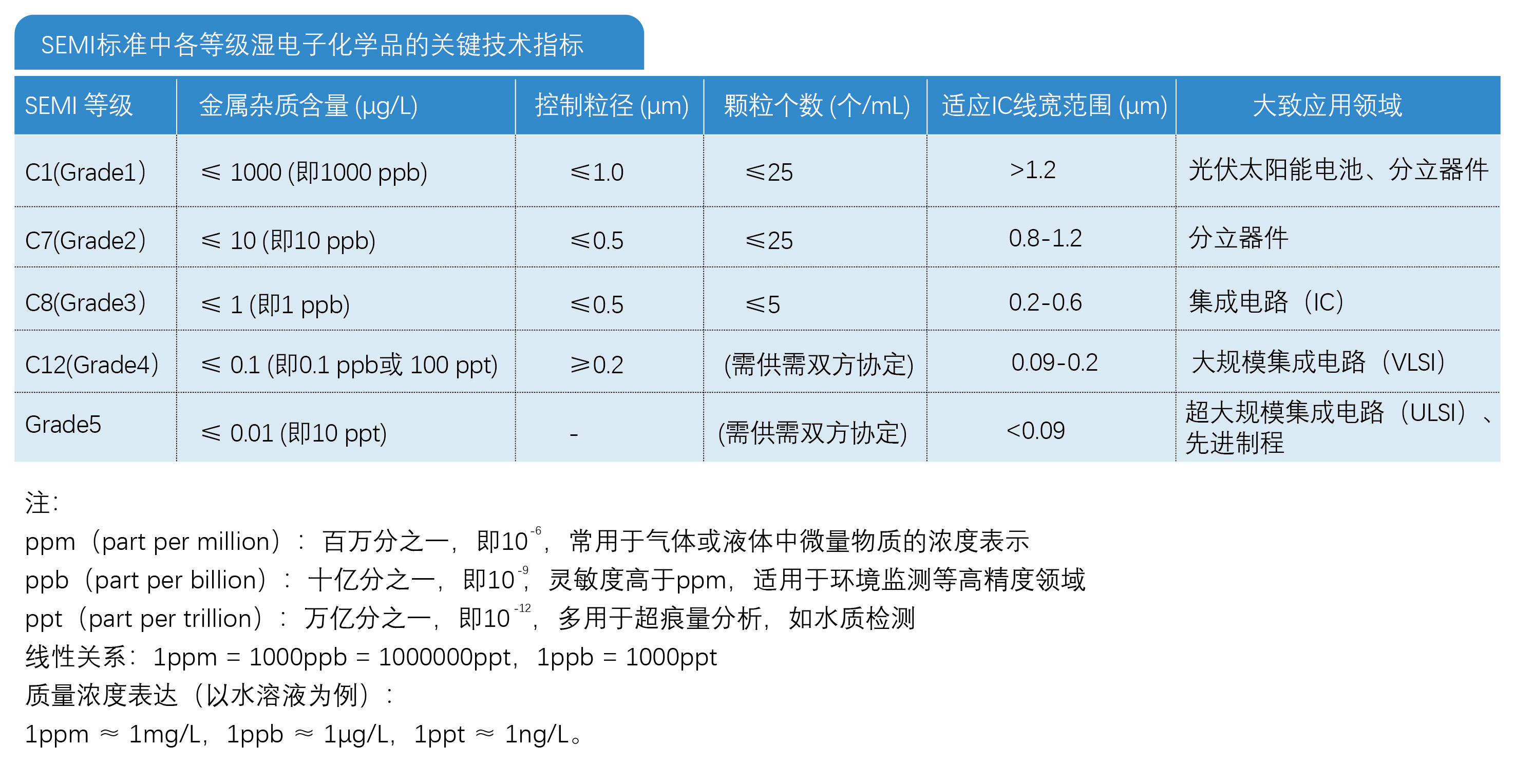 SEMI標(biāo)準(zhǔn)由國(guó)際半導(dǎo)體產(chǎn)業(yè)協(xié)會(huì)制定,是全球半導(dǎo)體行業(yè)公認(rèn)和廣泛采用的標(biāo)準(zhǔn)。它主要通過對(duì)金屬雜質(zhì)含量、顆粒含量和控制粒徑的嚴(yán)格控制,來定義濕電子化學(xué)品的純度級(jí)別,以適應(yīng)不同線寬的集成電路制造工藝。