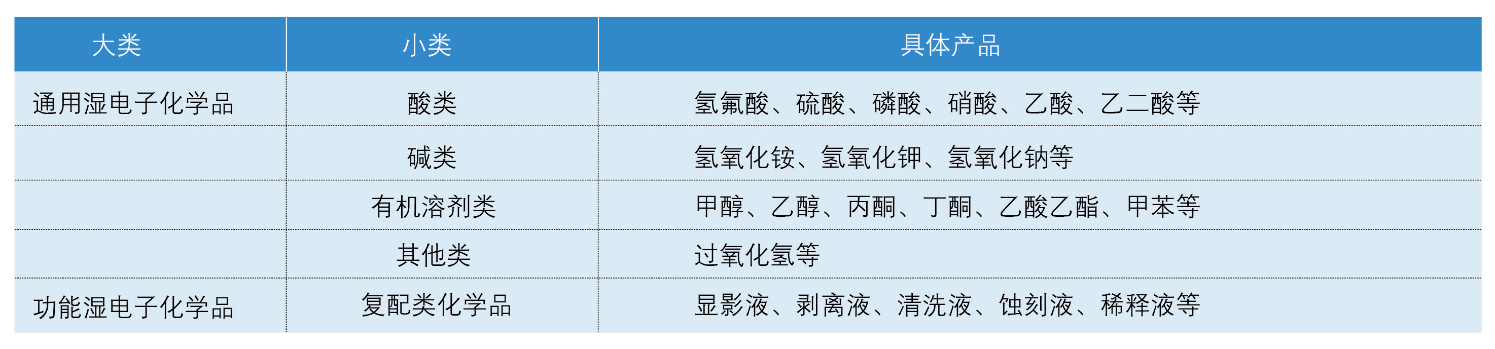 濕電子化學(xué)品又稱工藝化學(xué)品,是指主體成分純度大于 99.99%,塵埃顆粒粒徑控制在 0.5μm 以下,雜質(zhì)含量低于ppm級(jí)的化學(xué)試劑,是目前所有化學(xué)試劑中對(duì)顆??刂?、雜質(zhì)含量要求最高的試劑。濕電子化學(xué)品主要作用為清洗劑被廣泛應(yīng)用于微電子、光電子濕法工藝中,其核心要素為超高潔凈度和超低雜質(zhì)含量,因而它對(duì)原料、純化方法、配方工藝、容器、生產(chǎn)設(shè)備、環(huán)境控制、測(cè)試和運(yùn)輸設(shè)備等都有極為嚴(yán)格的要求。為了區(qū)分不同等級(jí)的濕電子化學(xué)品,國(guó)際半導(dǎo)體設(shè)備和材料組織(SEMI)通過濕電子化學(xué)品中金屬雜質(zhì)含量、控制粒徑范圍和顆粒個(gè)數(shù)等各項(xiàng)指標(biāo)將濕電子化學(xué)品劃分為 G1-G5 五個(gè)等級(jí),其中G5 等級(jí)的濕電子化學(xué)品要求最高,金屬雜質(zhì)濃度需達(dá)到10ppt級(jí)別,一般用于半導(dǎo)體行業(yè)高端集成電路,對(duì)應(yīng) 12 英寸的晶圓制備為主。G1等級(jí)的濕電子化學(xué)品要求最低,金屬雜質(zhì)濃度僅需達(dá)到10ppm級(jí)別,控制粒徑大于等于1.0 μm,顆粒個(gè)數(shù)小于等于25個(gè)/mL 即可,對(duì)應(yīng)下游行業(yè)為分立器件和太陽能電池板。中間的G2-G4等級(jí)濕電子化學(xué)品主要用于面板行業(yè)和半導(dǎo)體行業(yè)中中低端集成電路。