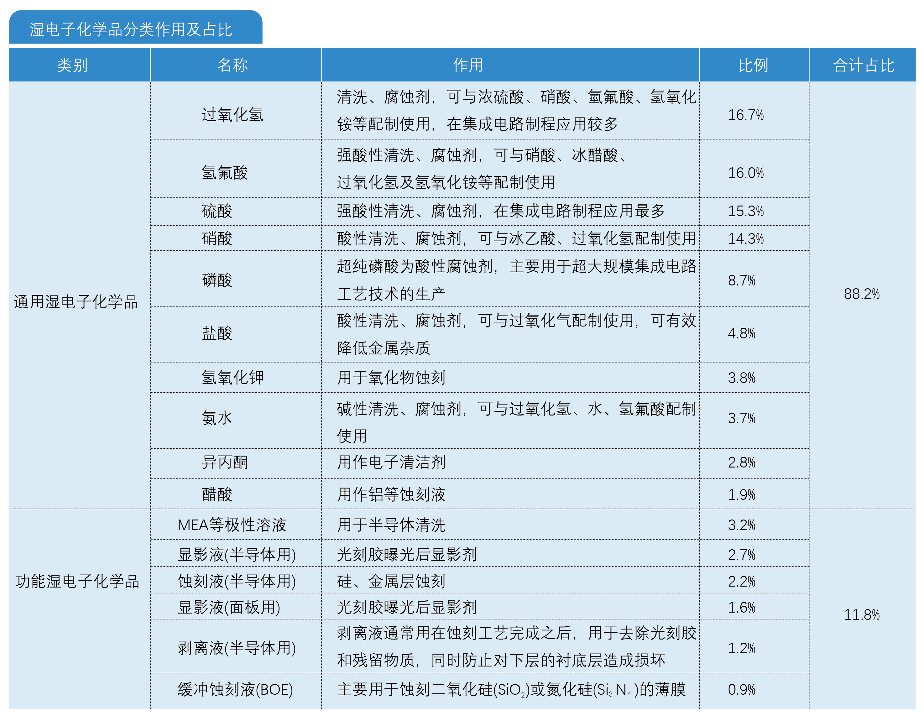 根據(jù)觀研報(bào)告網(wǎng)發(fā)布的《中國(guó)濕電子化學(xué)品市場(chǎng)發(fā)展態(tài)勢(shì)分析與投資戰(zhàn)略預(yù)測(cè)報(bào)告(2023-2030年)》顯示,從大類來分,一般可劃分為通用濕電子化學(xué)品和功能濕電子化學(xué)品。根據(jù)中國(guó)電子材料行業(yè)協(xié)會(huì)數(shù)據(jù),通用濕電子化學(xué)品占比88.2%,其中過氧化氫占比16.7%,氫氟酸占比16%,硫酸占比15.3%,硝酸占比14.3%。功能濕電子化學(xué)品占比11.8%,其中MEA等極性溶液占比3.2%,顯影液(半導(dǎo)體用)占比2.7%,蝕刻液(半導(dǎo)體用)占比2.2%。