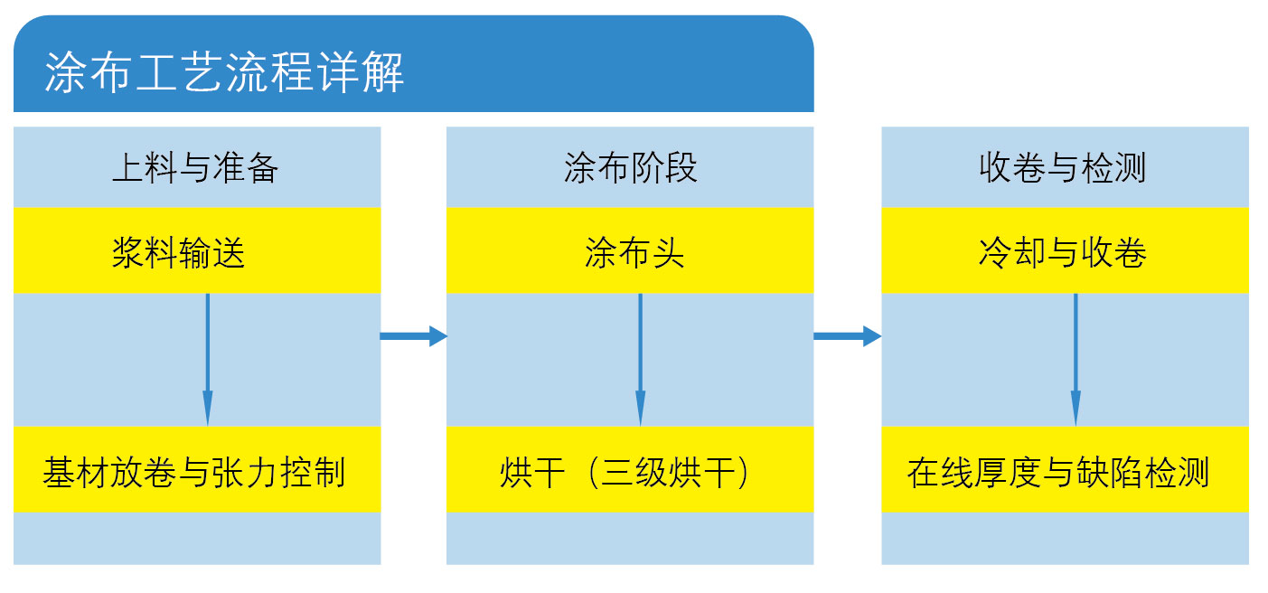 鋰離子電池電芯由陽極、陰極、電解液、隔膜和其他部件組成。鋰離子電池的工作原理可以簡單描述為:鋰離子在陽極和陰極之間移動,從而在充電和放電過程中攜帶并儲存電子。 在整個制造過程中,涂布是電池電芯制造關鍵步驟。 將攪拌均勻的漿料(活性物質、導電劑、粘結劑等的混合物)均勻、連續(xù)、穩(wěn)定地涂覆在金屬集流體(正極用鋁箔,負極用銅箔)上,并烘干溶劑,形成厚度一致、無缺陷的極片。 涂布工序直接決定了電池的容量、一致性、安全性和壽命??梢哉f,涂布質量是電池高性能的基石。